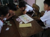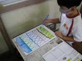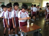 | 8月29日(金) 発育測定と保健指導「朝ご飯を考えよう」 3年生では、発育測定の後、朝ご飯の大切さを学びました。朝ご飯を食べると元気が出ること、集中できるので勉強ができることをまず学びました。次に、栄養バランスの良い朝ご飯を考えました。栄養によって、赤、黄、緑に分けられることを学び、グループごとにワークシートに一品ずつ食品を選んで、朝ご飯メニューを考えました。これから朝ご飯を食べる際には栄養のことも考えられるいいですね。 |