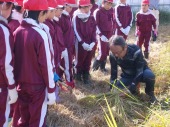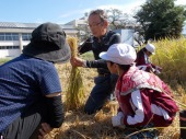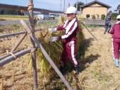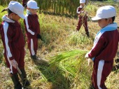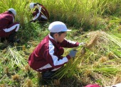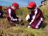 | 9月12日(金) 3年生 稲刈りをしました 雨上がりの晴天の下、3年生は生産組合の方々にご協力いただき稲刈りをしました。はじめに生産組合の方に稲刈りの方法と処理の仕方を教えていただき、早速作業に入りました。束をつかんで、鎌で刈り取り、2束をクロスに束ね、はさがけしていきます。暑い中でしたが「これは大変だ」「なかなかかれない」「けっこう進んだ」など友達と話をしながら進めていました。貴重な体験をさせていただき、生産組合の方々にはたいへんお世話医なりました。ありがとうございました。 |