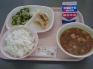 | 9月17日(水) 今日の給食。麻婆豆腐 +地場産プラスワン給食 今日の給食の献立・・・ご飯、揚げ米粉餃子、麻婆豆腐、キャベツとキュウリのサラダ、羽二重餅、牛乳。エネルギー 691kcal タンパク質 25.5g |