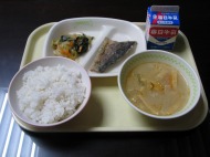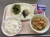 | 9月29日(月) 今日の給食。焼き鯖とあげと野菜の煮もの 今日の給食の献立・・・ご飯、焼き鯖、あげと野菜の煮物、キュウリの中華漬、牛乳。エネルギー626kcal タンパク質 27.4g |