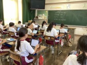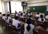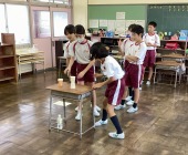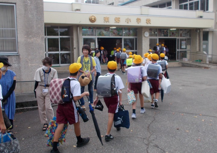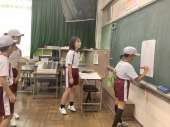 | 8月27日(水) 授業再開。暑いけれど頑張ろう! 長い夏休みが終わり、本日授業が再開されました。東郷っ子は、それぞれの夏休みの思い出を胸に休み中に取り組んだ課題を持って元気に登校してきました。特の民生委員の方々も挨拶に立ってくださいました。元気な笑顔が見られてうれしいです。全校朝礼は、熱中症対策のため、オンラインで教室で行いました。その後、教室では、課題を集めたり夏休みの思い出を語ったりしました。 1年生は、福井テレビの取材も入って、インタビューも受けていました。 |
