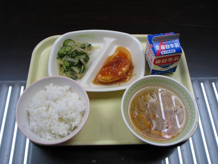 | 9月1日(月) 今日の給食。タラのコロコロ南蛮漬け 今日の給食の献立・・・ご飯、タラのコロコロ南蛮漬け、切り干し大根の炒め煮、じゃがいもの味噌汁、牛乳。エネルギー 607 kcal タンパク質 26.1 g |