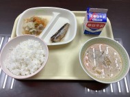 | 9月24日(水) 今日の給食。いわしの梅煮 今日の給食の献立・・・ご飯、いわしの梅煮、ウインナーと野菜の炒め物、ピリ辛豚汁、牛乳。エネルギー 574kcal タンパク質 26.0g |