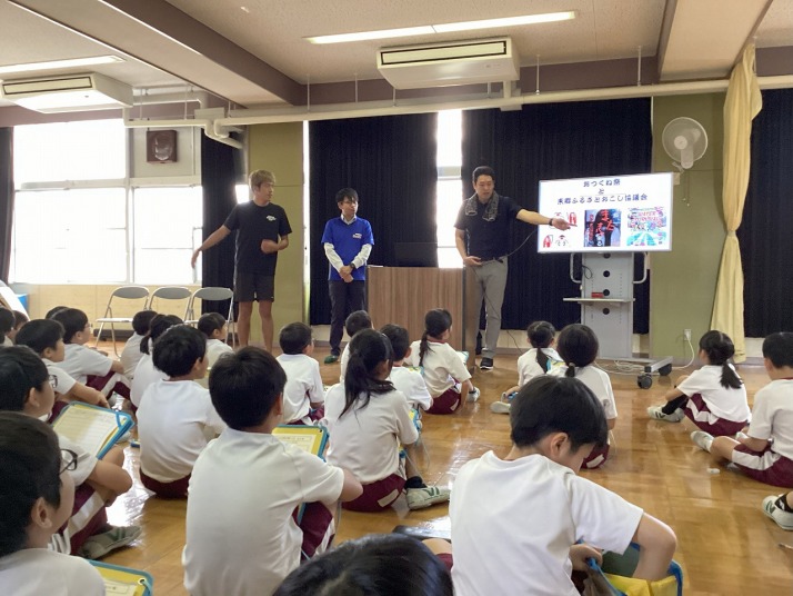 | 9月24日(水) 東郷の魅力とは?part2 東郷地区の魅力について学んでいる3年生。今日は、その学びのゲストティーチャーとして東郷地区を盛り上げるイベントや取組を行っている東郷ふるさとおこし協議会の方々にお越しいただき、おつくね祭やふるさとおこし協議会の取組について教えていただきました。3人の方々の楽しい掛け合いやクイズで、集中してお話を伺うこともできました。お忙しい中ありがとうございました。 |