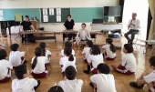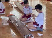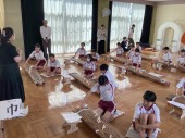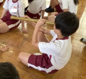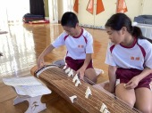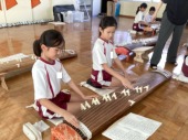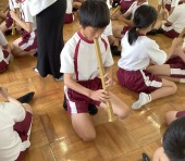 | 9月26日(金) 和楽器体験をしました 5年生音楽の学習として、今日は箏と尺八の体験をしました。はじめに学級ごとに箏の名前や演奏の仕方を教えていただきました。実際に箏にふれる機会がほぼないため、大変興味深く、爪をつけて弦をはじくときは緊張した面持ちでした。しかし、なれてくるとみんなで「さくら」を演奏することまでできました。 |