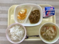 | 9月29日(月) 今日の給食。ドライカレー 今日の給食の献立・・・ご飯、ドライカレー、野菜のスープ煮、フルーツミックス、牛乳。エネルギー625kcal タンパク質 20.8g |