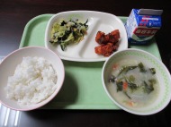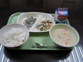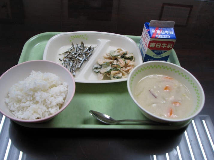 | 11月4日(火) 今日の給食。豆乳米粉ポタージュ 今日の給食の献立・・・ご飯、豆乳米粉ポタージュ、レンコンのごまサラダ、いり煮干し、牛乳。エネルギー 589kcal タンパク質 21.9g |