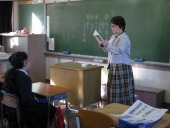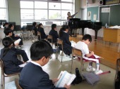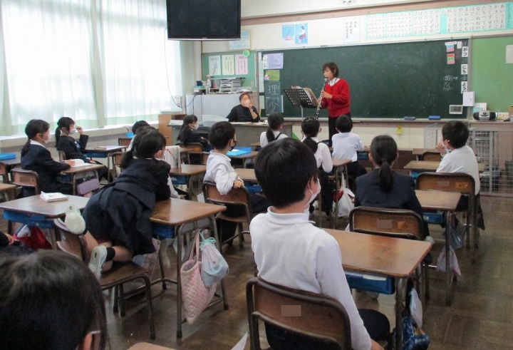 | 11月28日(金) 先生とお別れ 7月の夏休み前からお手伝いしてくださっていた兼務の先生が本務校に戻ることになり、今日は最終日でした。先生から最後に御礼にクラリネットで曲を演奏してくださり、みんなも口ずさみながら演奏を楽しみました。 |