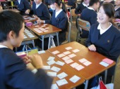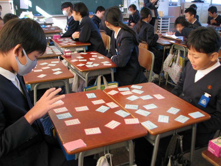 | 11月4日(火) 百人一首にチャレンジ。 6年生は明日から修学旅行。古都奈良・京都を訪れます。今日は、むかしの都に思いをはせながら百人一首にチャレンジしました。 |