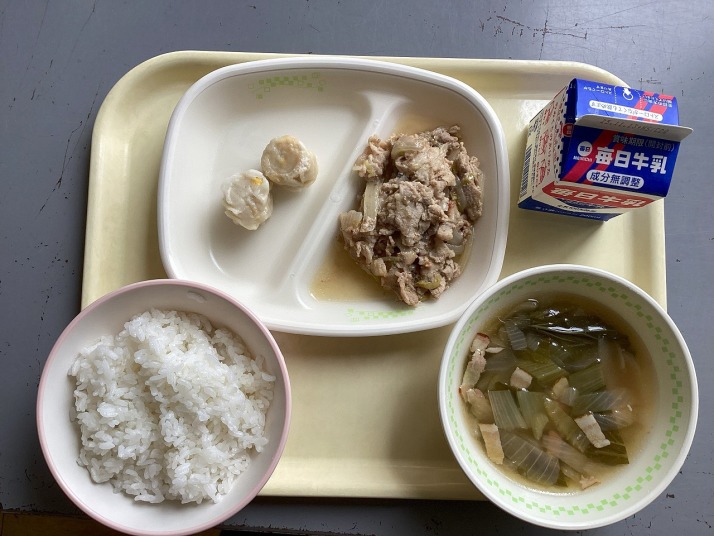 | 11月5日(水) 今日の給食。ねぎ塩豚丼 今日の給食の献立・・・ご飯、豚肉炒め、コーンシュウマイ、青梗菜スープ、牛乳。エネルギー 604kcal タンパク質 25.7g |