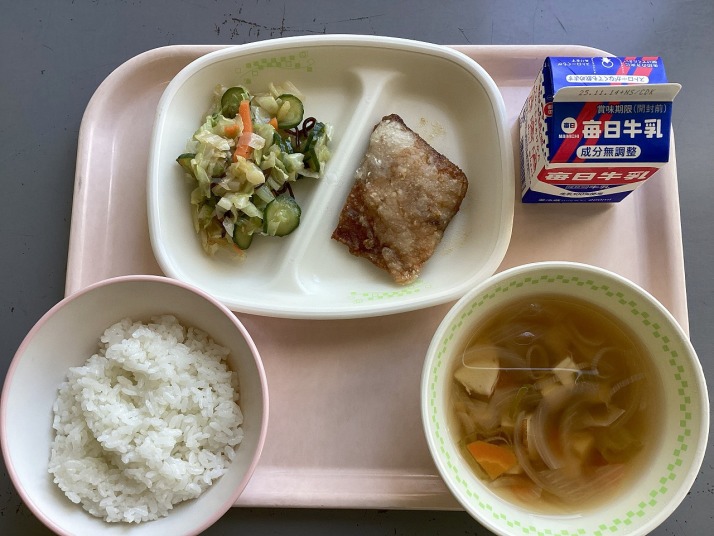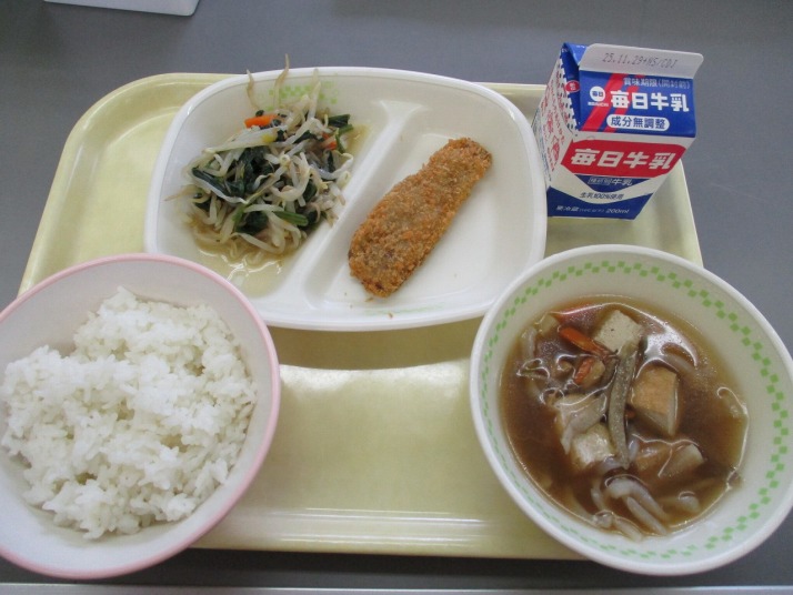 | 11月21日(金) 今日の給食。県産いわしのフライ 今日の給食の献立・・・ご飯、県産いわしのフライ、うららのサラダ、ぼっかけ汁、牛乳。エネルギー 557kcal タンパク質 22.7g |