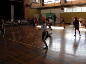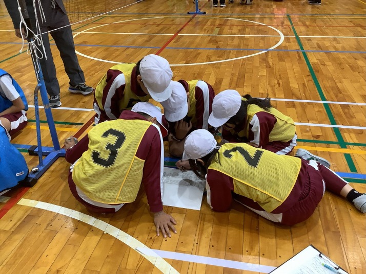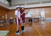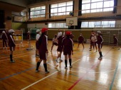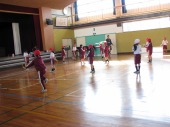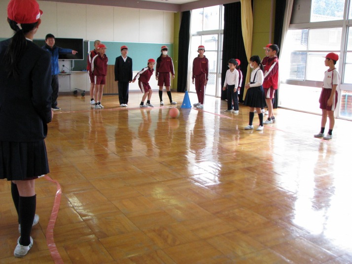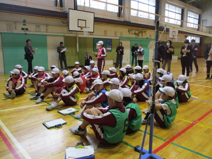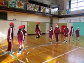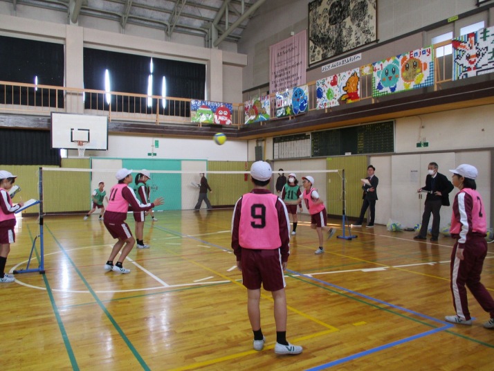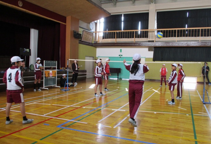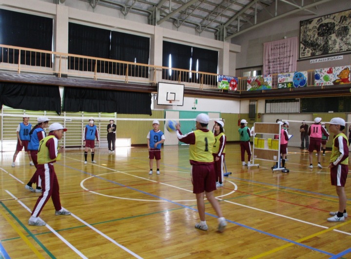 | 11月26日(水) キャッチ・パス・アタックバレー 4年生の体育では、キャッチ・パス・アタックバレーにチャレンジしています。バドミントンのコートを使い、今日は6人1チームでゲームをしていました。相手からのサーブをキャッチし、セッターにパス、セッターはトスを上げてアタッカーが打つという役割分担をしながら、笑顔で楽しんでいました。 |