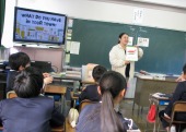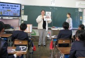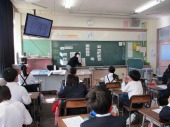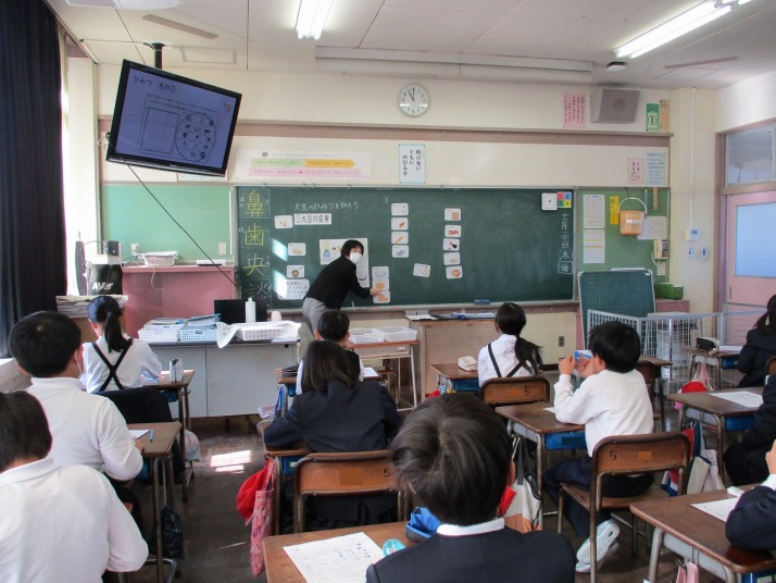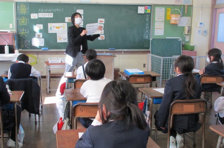 | 11月20日(木) 栄養指導がありました。 3年生で、栄養教諭による栄養指導がありました。テーマは「大豆のひみつを知ろう」です。大豆はいろいろな製品に加工され、その豊富な栄養を様々な方法で摂取できること、好き嫌いせずに大豆の栄養取っていこうとのお話がありました。 |
