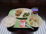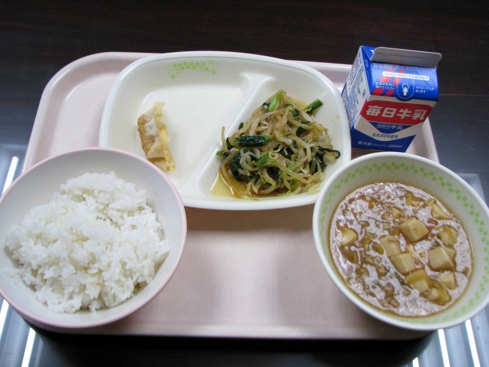 | 11月12日(水) 今日の給食。マーボー豆腐 今日の給食の献立・・・ご飯、ふくい豚揚げ餃子、マーボー豆腐、もやしと小松菜のおひたし、牛乳。エネルギー 664kcal タンパク質 26.4g(揚げ餃子が2個の場合) ※本日の揚げ餃子は、製造業者のトラブルにより必要数が給食センターに納品されず 小学校は、1個に変更になりました。代わりに、マーボー豆腐の量を2割程度増やされていました。 |