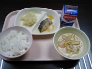 | 11月14日(金) 今日の給食。県産さわらの和風だれかけ 今日の給食の献立・・・ご飯、県産さわらの和風だれかけ、マッシュポテト、大根の打ち豆汁、牛乳。エネルギー 590kcal タンパク質 27.3g |