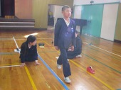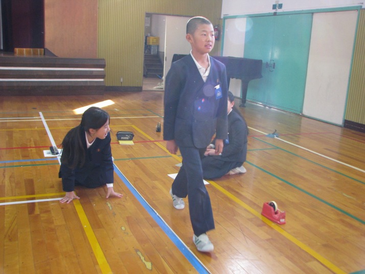 | 11月17日(月) 平均を考えよう。 5年生の算数では「平均」について学習します。今日は体育館で、メジャーを広げ、一人一人の10歩の長さを測っていました。この後一人一人の歩幅の平均を出していくそうです。 |
