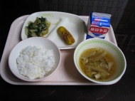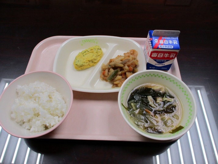 | 11月20日(木) 今日の給食。ほうれん草オムレツ 今日の給食の献立・・・ご飯、ほうれん草オムレツ、じゃがいものきんぴら、わかめスープ、牛乳。エネルギー 592kcal タンパク質 18.6g |