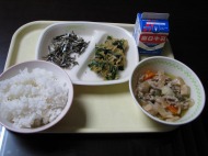 | 11月19日(水) 今日の給食。切り干しのおひたし 今日の給食の献立・・・ご飯、切り干しのおひたし、かみかみにぼし、高野豆腐のすき焼き風に、牛乳。エネルギー 582kcal タンパク質 28.2g |
