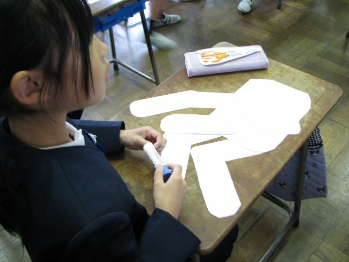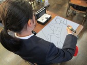 | 11月19日(水) 紙版画をしよう。 この季節はどの学年も版画の学習が始まります。2年生は、サツマイモ掘りの様子を版画にしようと、今日は自分の体の部分の版を作っていました。腕や足をどう配置するといいのか考えながらのり付けをしていました。 |
