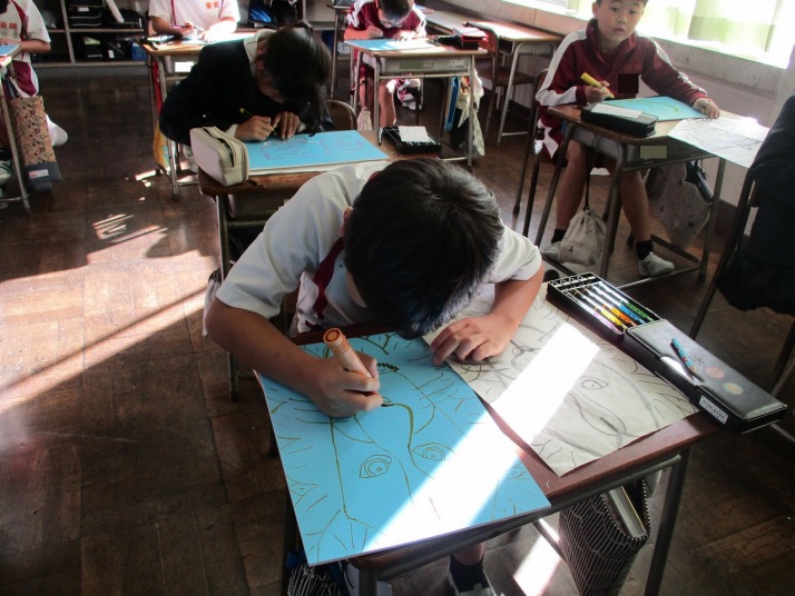| 11月20日(木) 版画をしよう。 3年生以上は、木版画に取り組んでいます。3年生は動物の絵を、5年生は自分の活動をそれぞれ下書きをしたり掘り出したりしていました。どの学年も大胆な構図で仕上がりが楽しみです 。 |