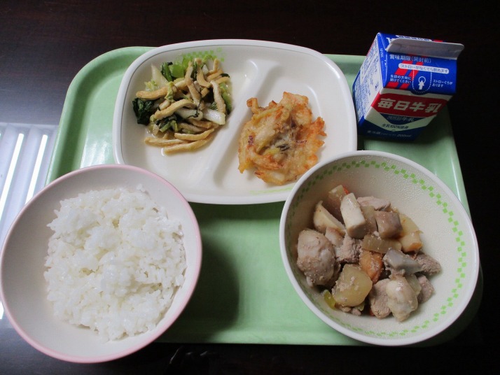 | 11月27日(木) 今日の給食。ふくいかきあげ 今日の給食の献立・・・ご飯、ふくいかきあげ、大根と里芋のうま煮、小松菜の煮浸し、牛乳。エネルギー 623kcal タンパク質 25.9g |