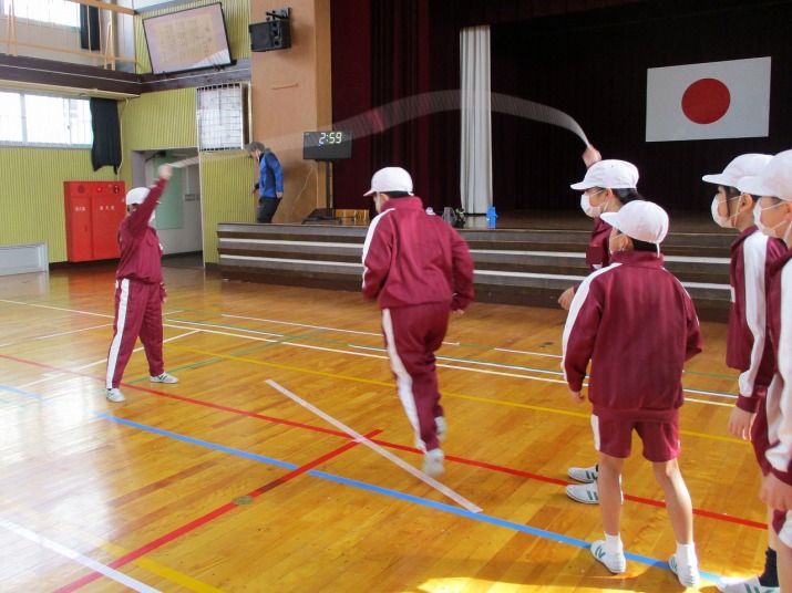 | 11月17日(月) なわとびの学習が始まりました。 1,2年生の体育では、なわとびの学習が始まりました。1年生はまずなわの始末から。上手に結ぶ練習をしていました。2年生は、早速さっそく様々な跳び方にチャレンジしていました。 |